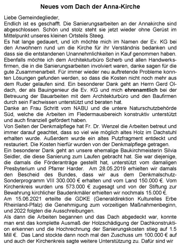 Generaldirektion kulturelles Erbe in Rheinland-Pfalz (GDKE), besteht eine erhebliche Finanzierungslücke. Ohne weitere Unterstützung kann unsere Kirchengemeinde dieses riesige Projekt nicht
